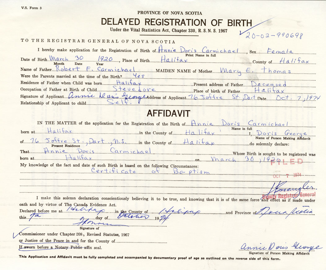 Signature of Applicant Annie Doris George Address of Applicant Dartmouth Date October 7, 1974