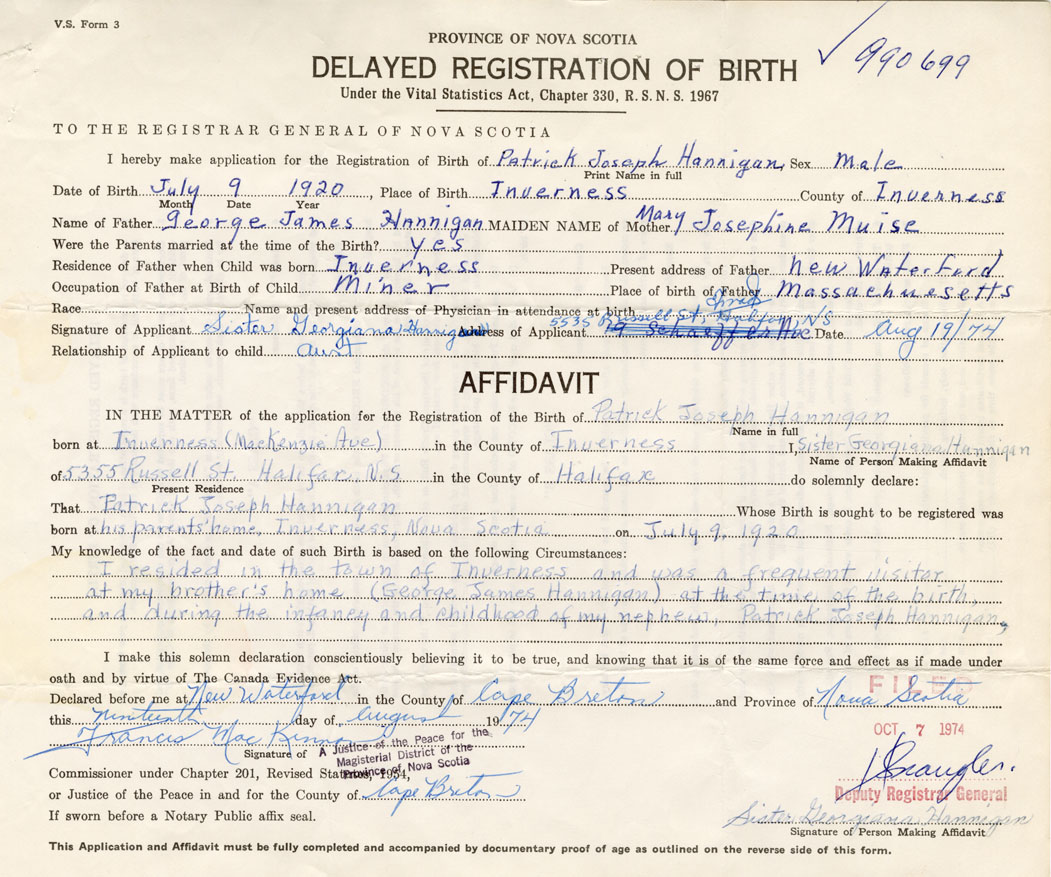 I resided in the town of Inverness and was a frequent visitor at my brother's home (George James Hannigan) at the time of the birth and during the infancy and childhood of my nephew, Patrick Joseph Hannigan.