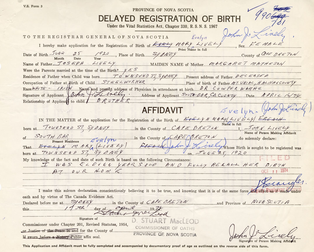 I hereby make application for the Registration of Birth of Mary EvelynLively Sex Female