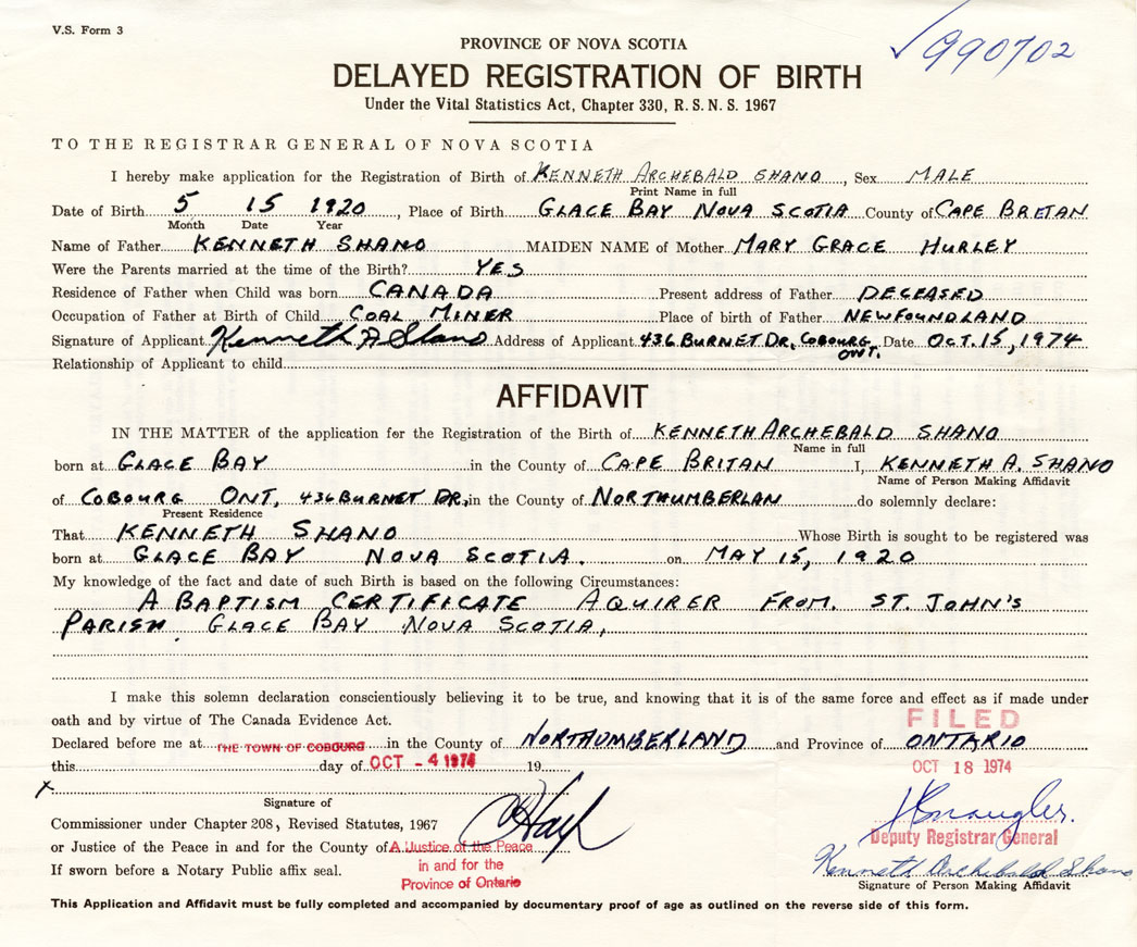 Date of Birth May 15, 1920 Place of Birth Glace BayCounty of Cape Breton