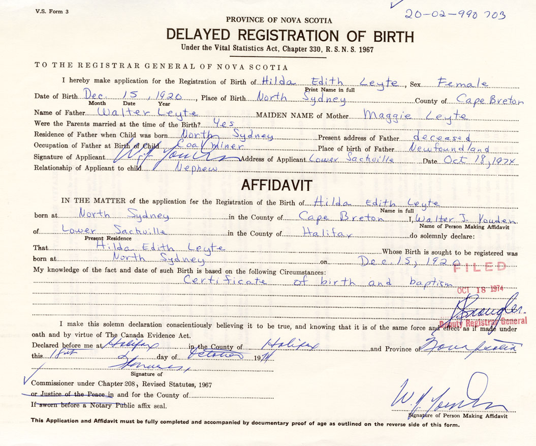 I hereby make application for the Registration of Birth of Hilda EdithLeyte Sex Female