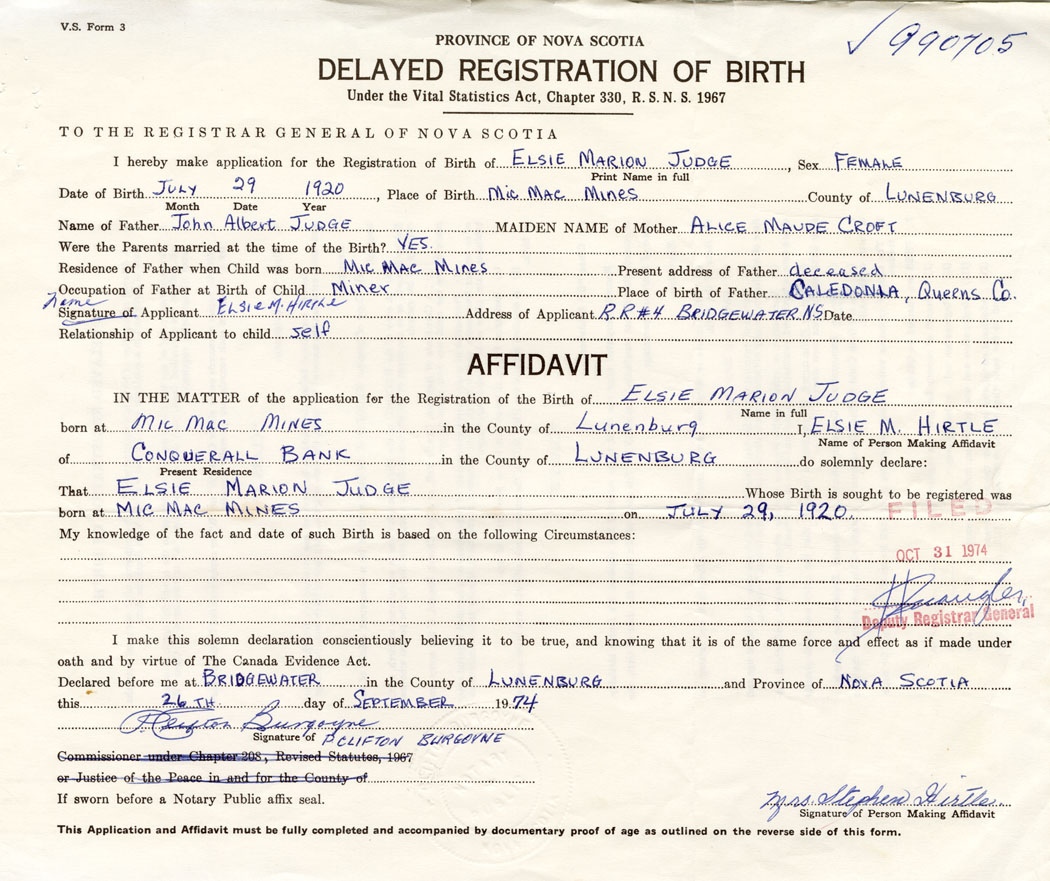 Date of Birth July 29, 1920 Place of Birth Mic Mac MinesCounty of Lunenburg