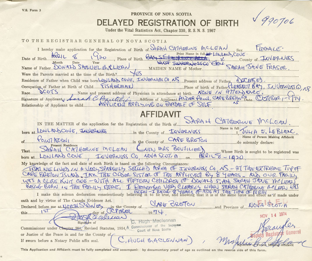 That we lived in a very sparsely settled arm of Inverness County - at the extreme tip of Cape Breton Island. I am the older sister of the applicant by 8 years and our family was a close knit one - with all fifteen children of Donald S. and Sarah Jane McLean being born in the family home. I remember very clearly when Sarah Catherine McLean was born - I being 8 years of age at the time of her birth. - Julia E. LeBlanc