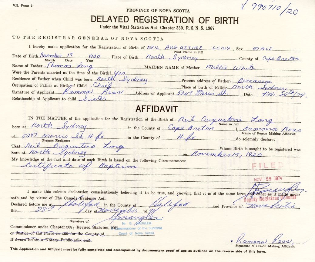 I hereby make application for the Registration of Birth of Neil AugustineLong Sex Male