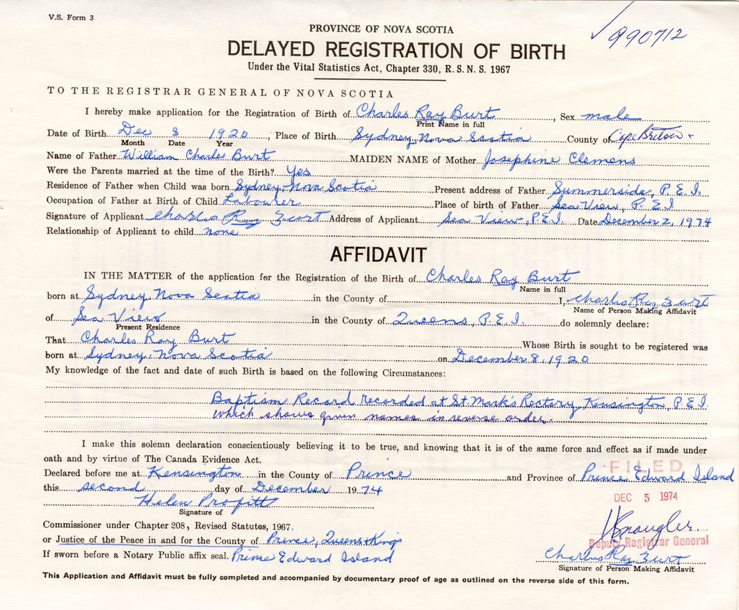 Signature of Applicant Charles Ray Burt Address of Applicant Sea View, PEI Date December 2, 1974