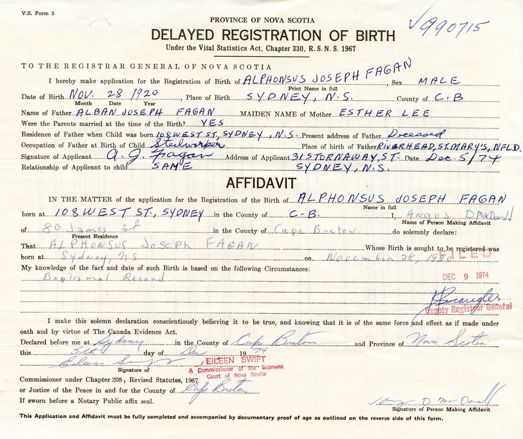 That Alphonsus JosephFagan Whose Birth is sought to be registered was