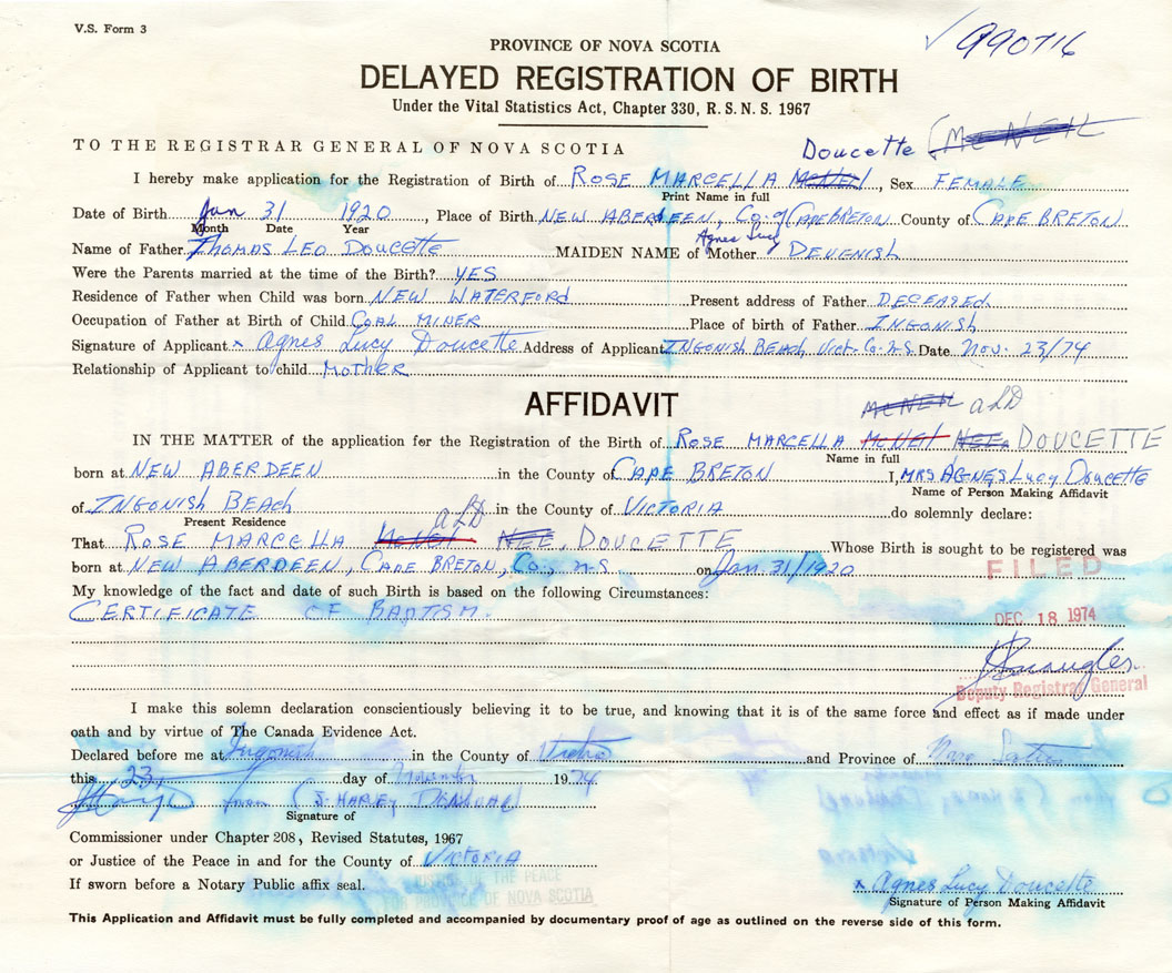 IN THE MATTER of the application for the Registration of the Birth of Rose MarcellaDoucette