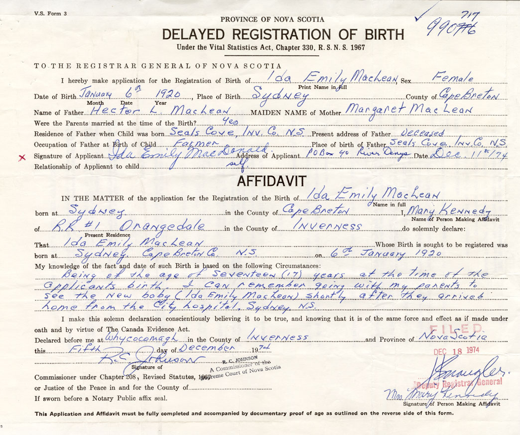 Being of age of seventeen (17) years at the time of the applicants birth. I can remember going with my parents to see the new baby (Ida Emily MacLean) shortly after they arrived home from the City Hospital, Sydney.