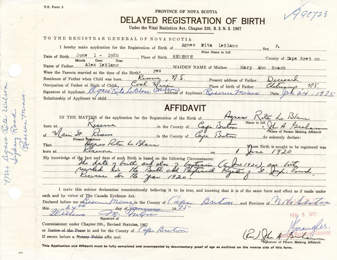 Date of Birth June 1, 1920 Place of Birth ReserveCounty of Cape Breton