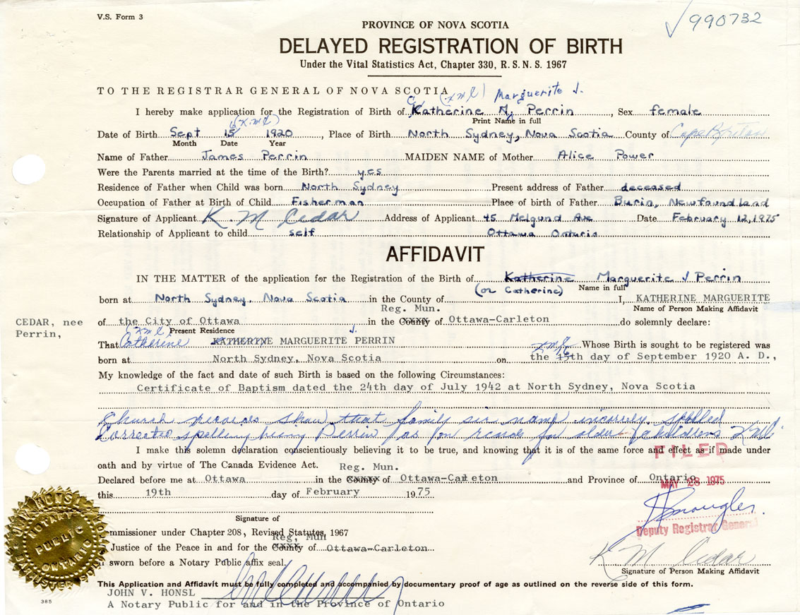 IN THE MATTER of the application for the Registration of the Birth of Catherine Marguerite J.Perrin