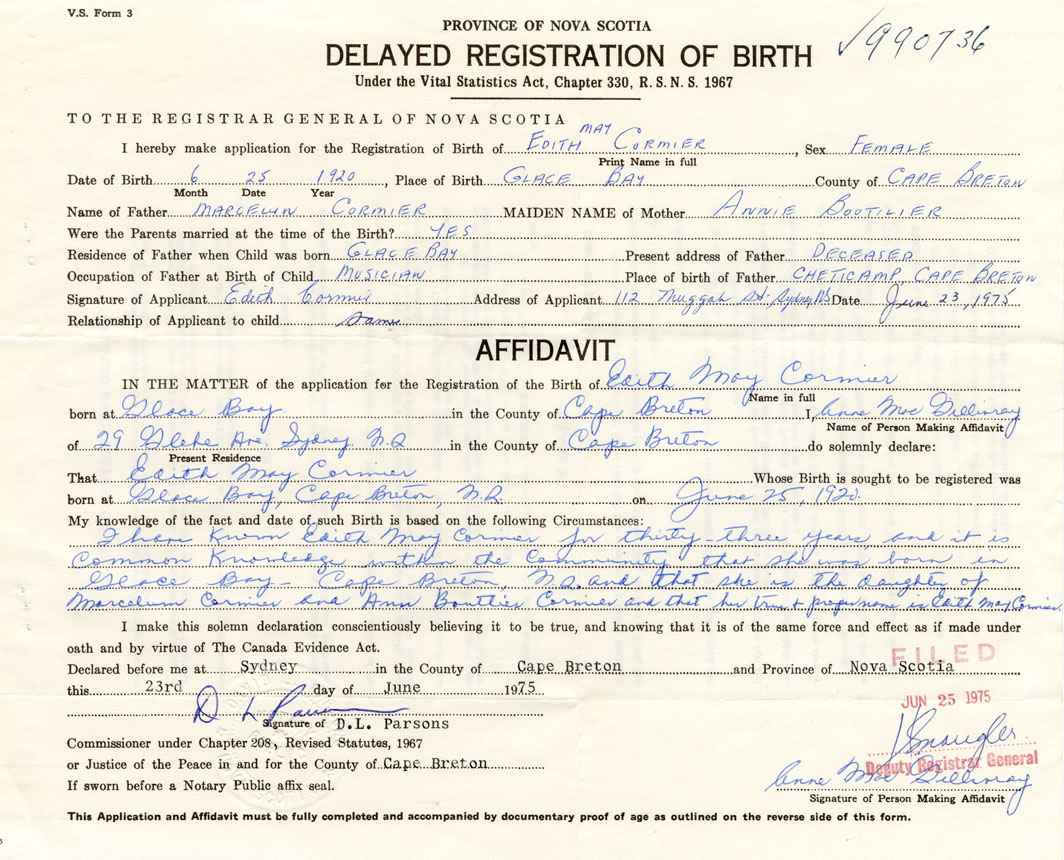 I have known Edith May Cormier for thirty-three years and it is common knowledge within the community that she was born in Glace Bay, Cape Breton and that she is the daughter of Marcellin Cormier and Ann Boutilier Cormier and that her true and proper name is Edith May Cormier. - Anne MacGillivray
