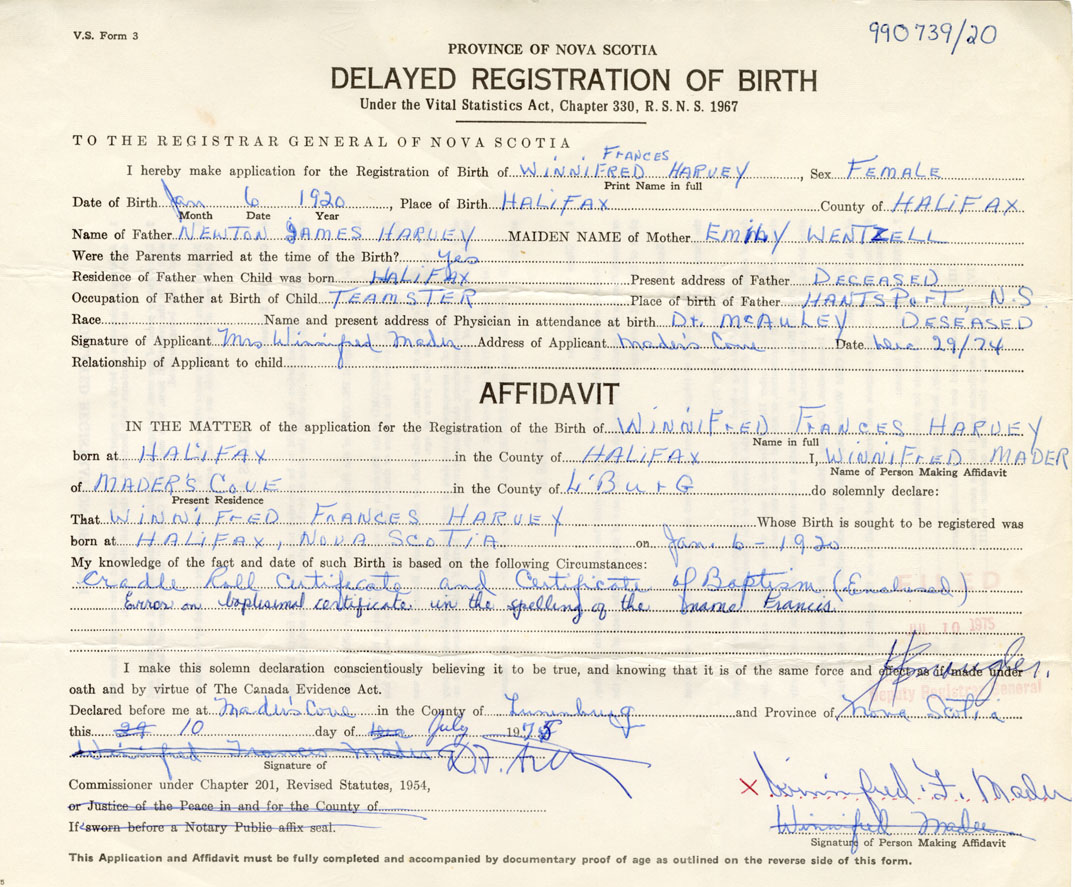 Signature of Applicant Winnifred Mader Address of Applicant Mader's Cove Date December 29, 1974