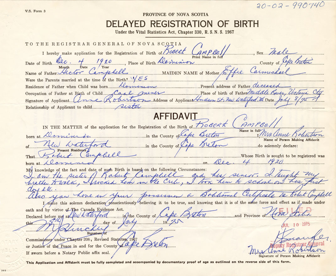 Signature of Applicant Anne Robertson Address of Applicant New Waterford Date July 9, 1975
