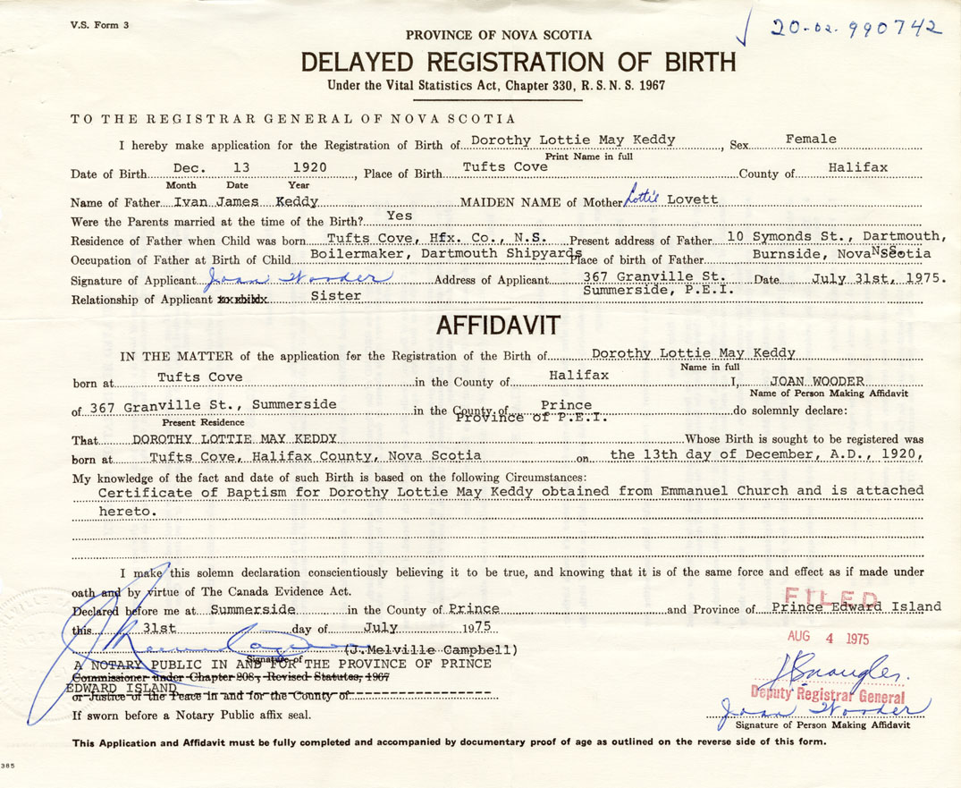 Date of Birth December 13, 1920 Place of Birth Tufts CoveCounty of Halifax