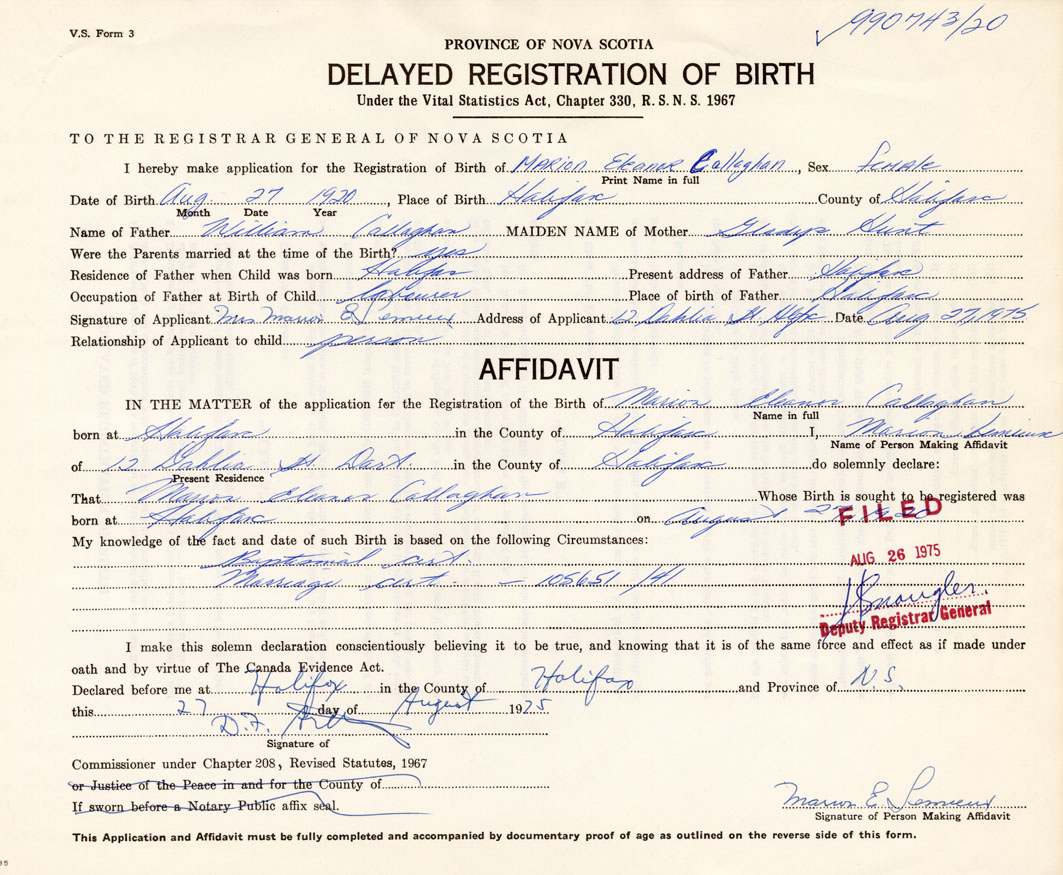 I hereby make application for the Registration of Birth of Marion EleanorCallaghan Sex Female