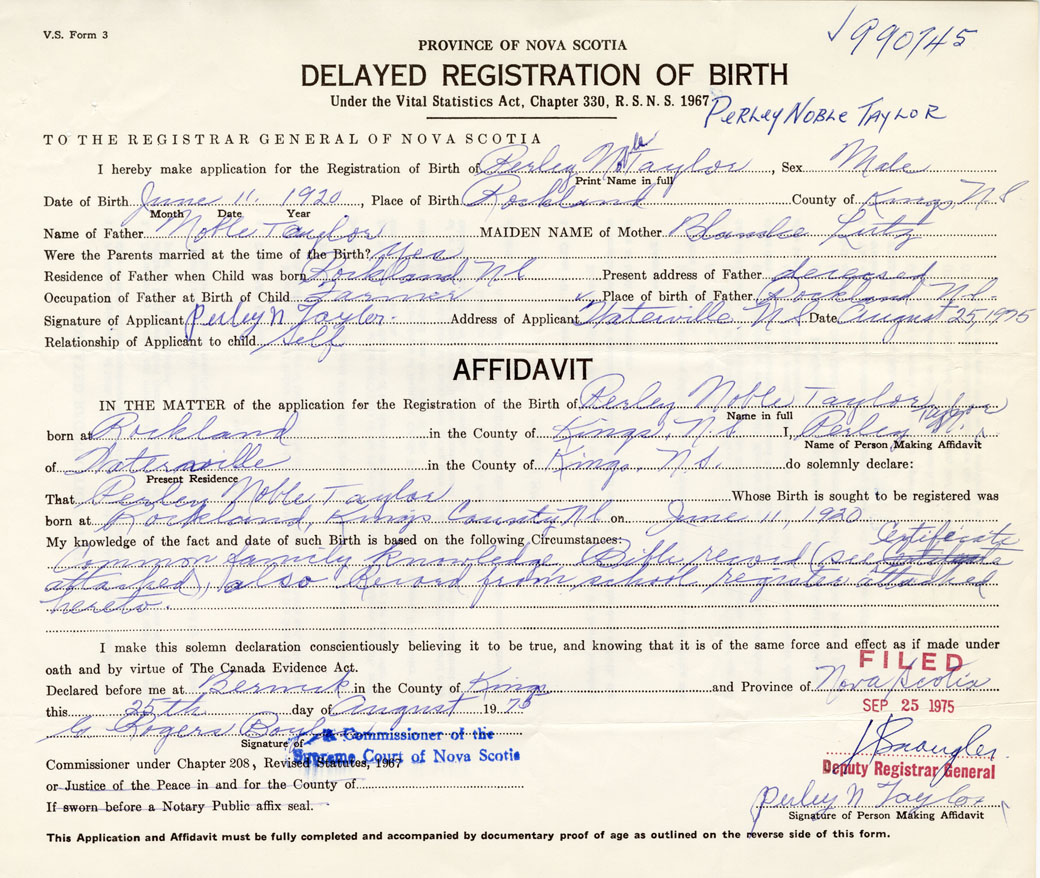 I hereby make application for the Registration of Birth of Perley NobleTaylor Sex Male