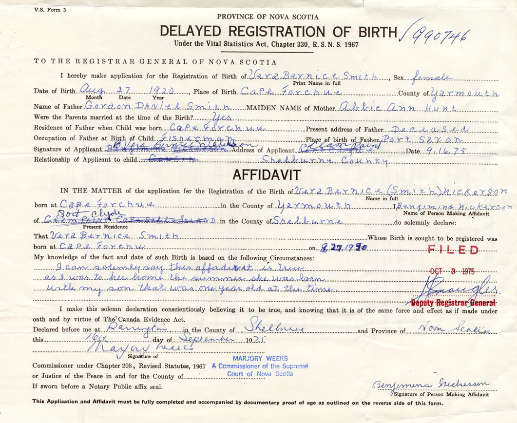 Signature of Applicant Vera Bernice Smith Address of Applicant Clam Point Date September 16, 1975