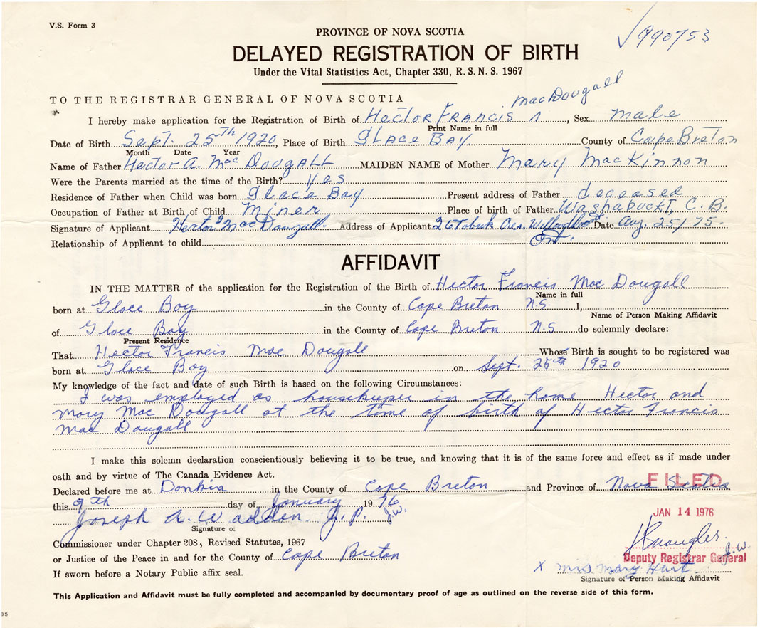 I was employed as housekeeper in the home of Hector and Mary MacDougall at the time of birth of Hector Francis MacDougall