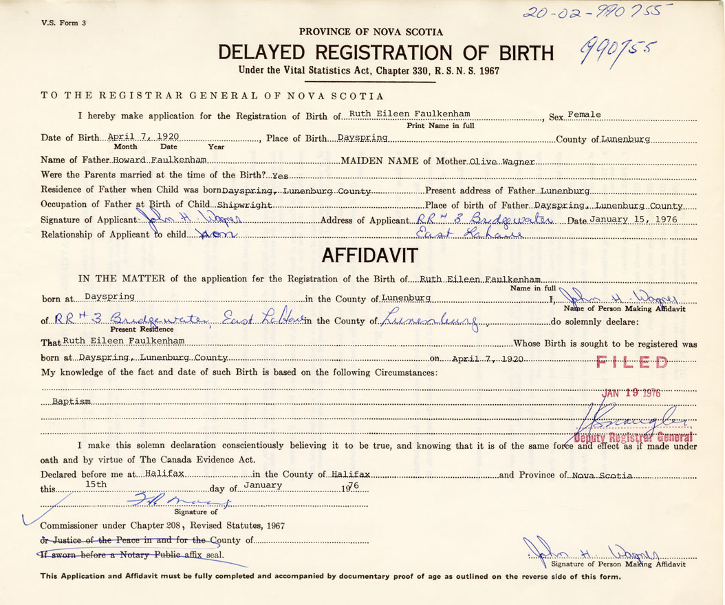 I hereby make application for the Registration of Birth of Ruth EileenFaulkenham Sex Female