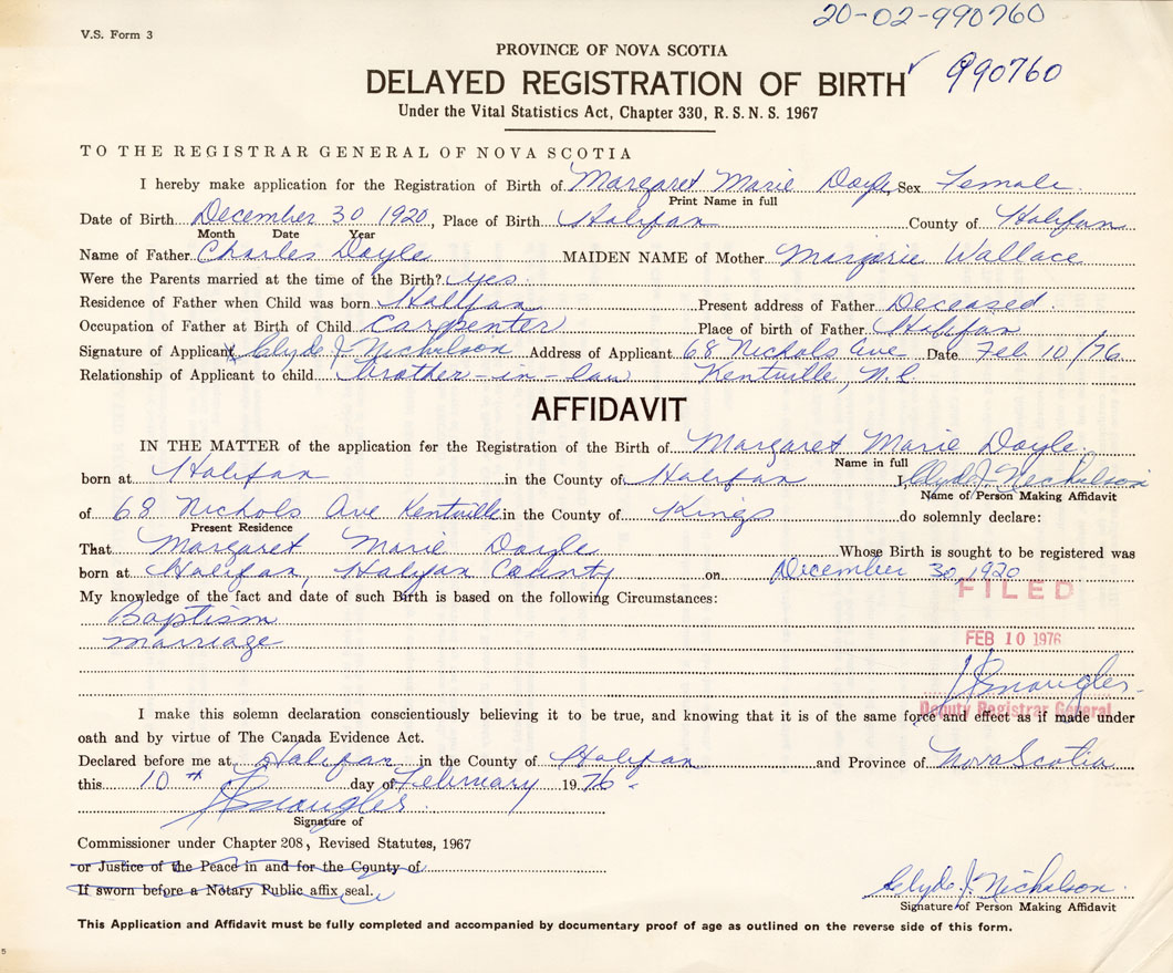 I hereby make application for the Registration of Birth of Margaret MarieDoyle Sex Female