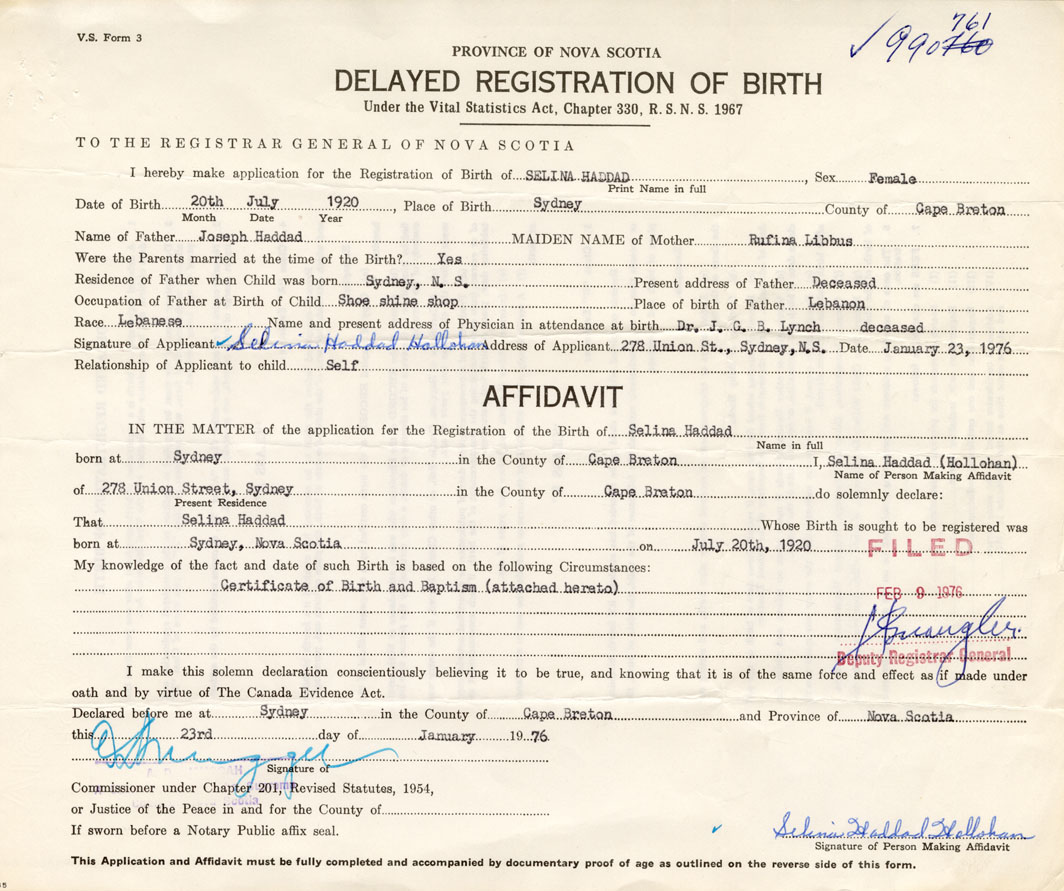 I hereby make application for the Registration of Birth of SelinaHaddad Sex Female