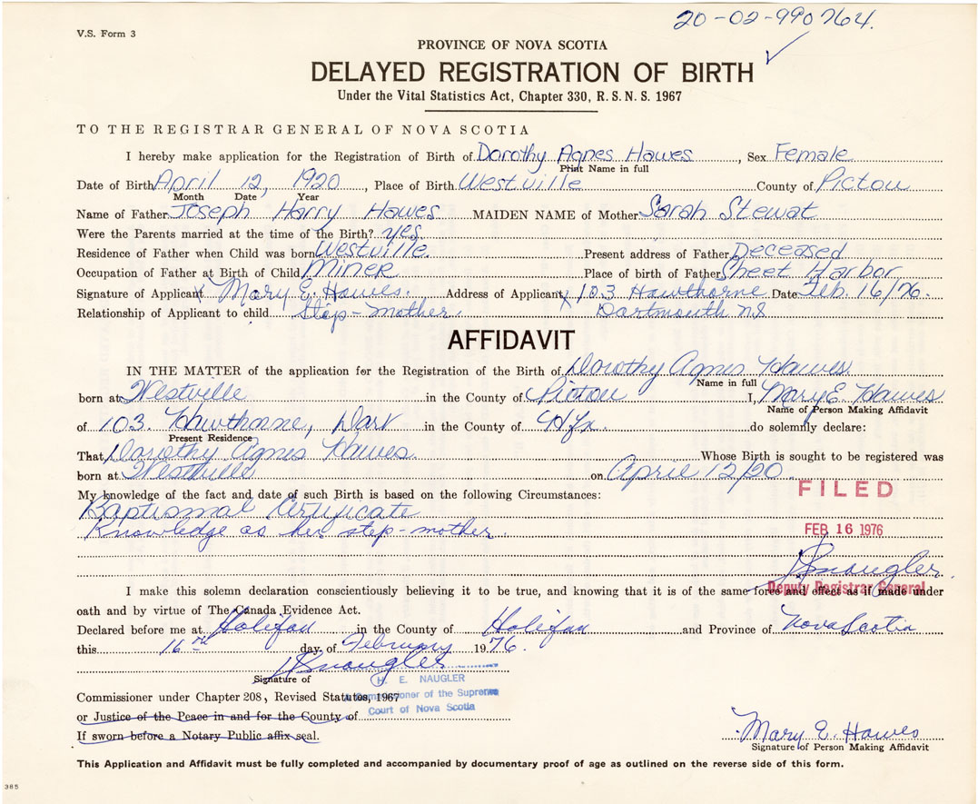 That Dorothy AgnesHawes Whose Birth is sought to be registered was