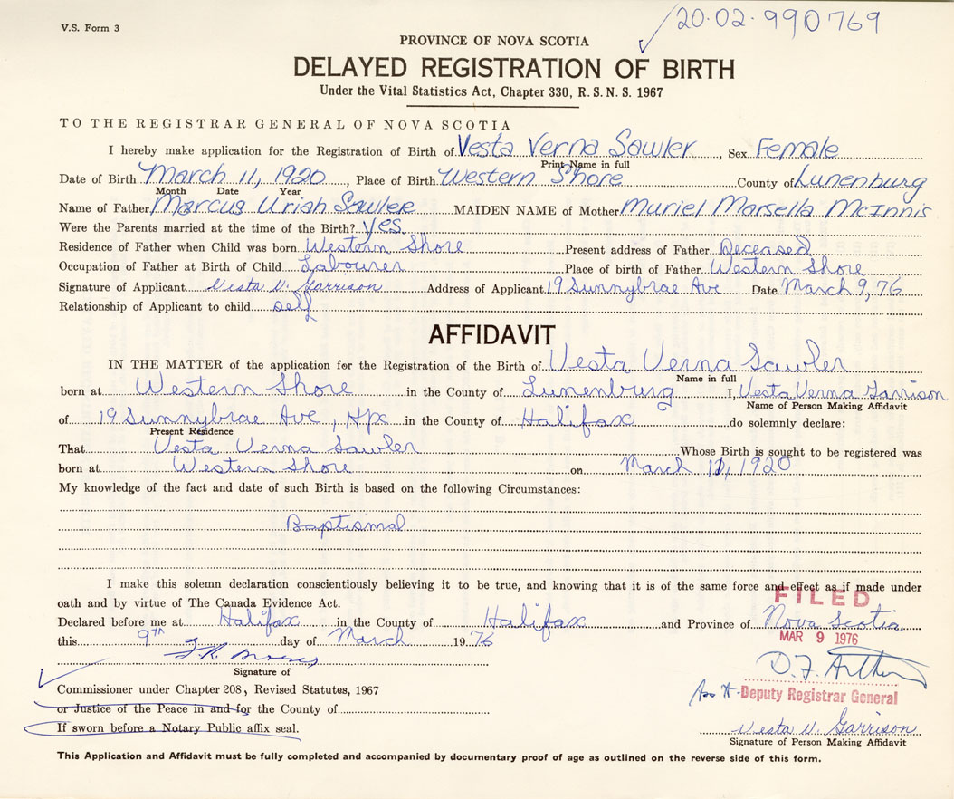 Signature of Applicant Vesta V. Garrison Address of Applicant Halifax Date March 9, 1976