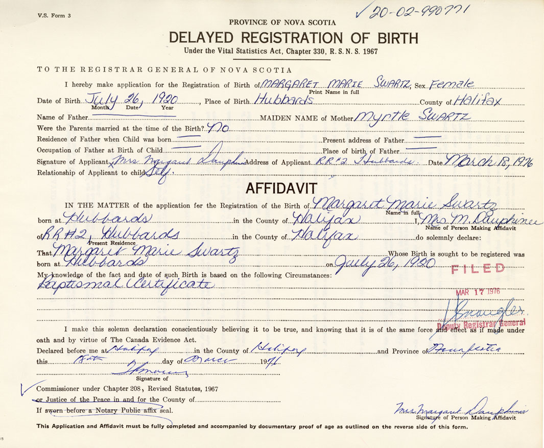 Date of Birth July 26, 1920 Place of Birth HubbardsCounty of Halifax