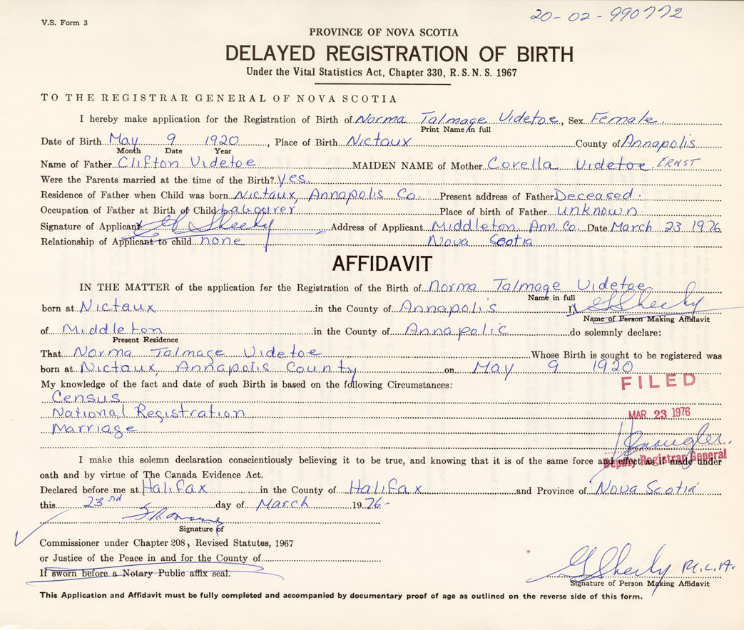 IN THE MATTER of the application for the Registration of the Birth of Norma TalmageVidetoe