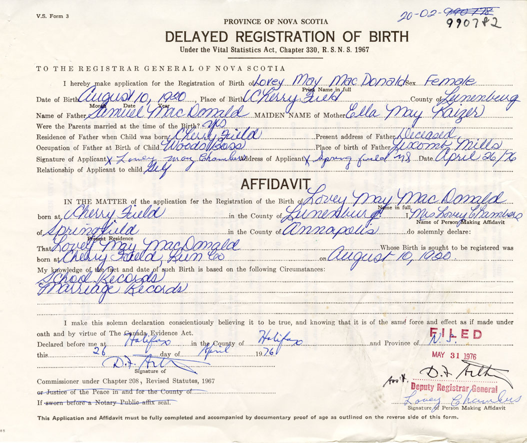 I hereby make application for the Registration of Birth of Lovey MayMacDonald Sex Female