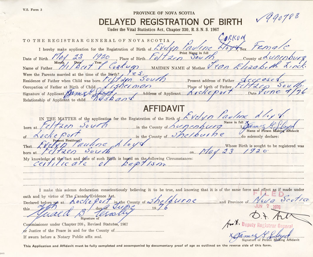 I hereby make application for the Registration of Birth of Evelyn PaulineCorkum Sex Female