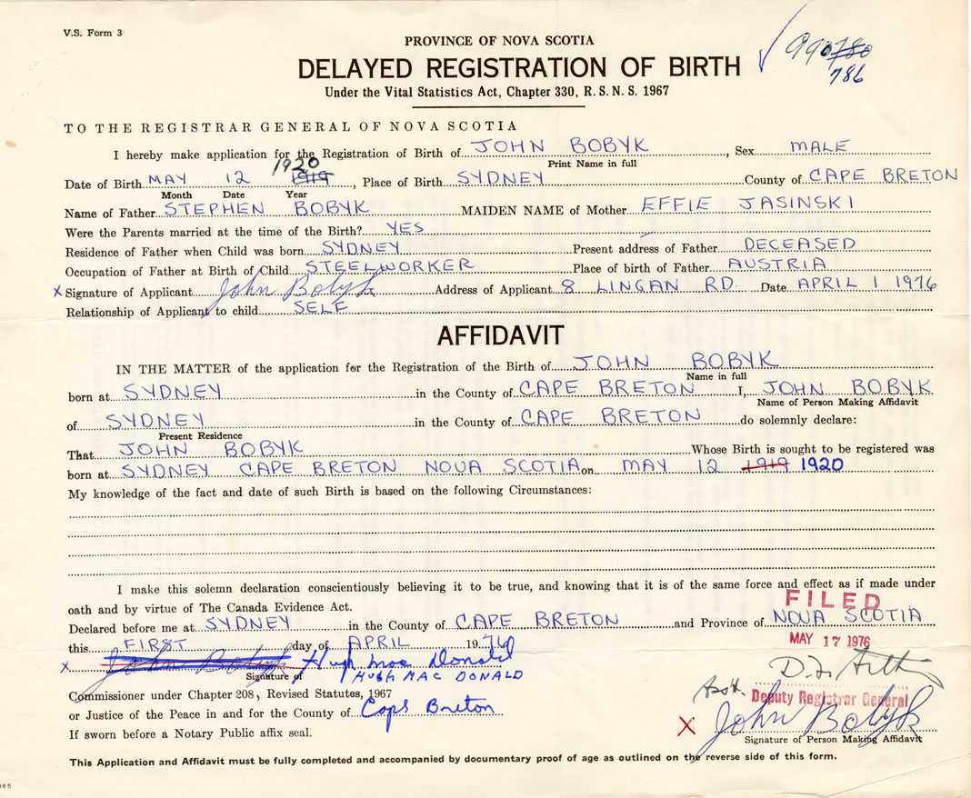 Date of Birth May 12, 1920 Place of Birth SydneyCounty of Cape Breton
