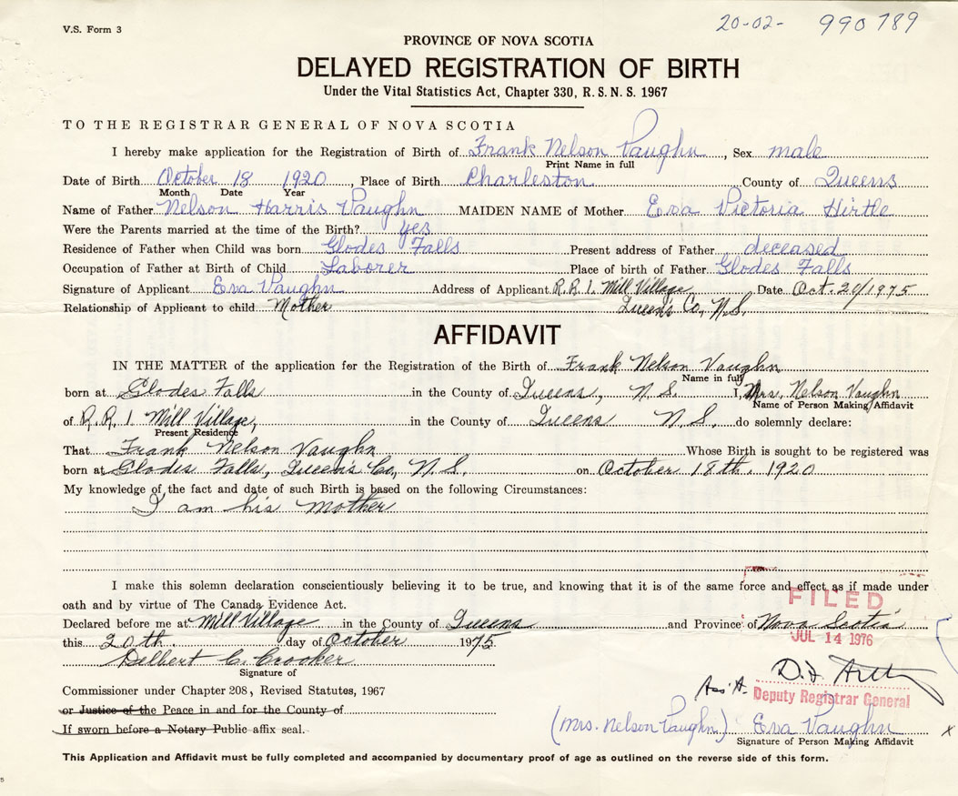 Name of Father Nelson Harris Vaughn MAIDEN NAME of Mother Eva Victoria Hirtle