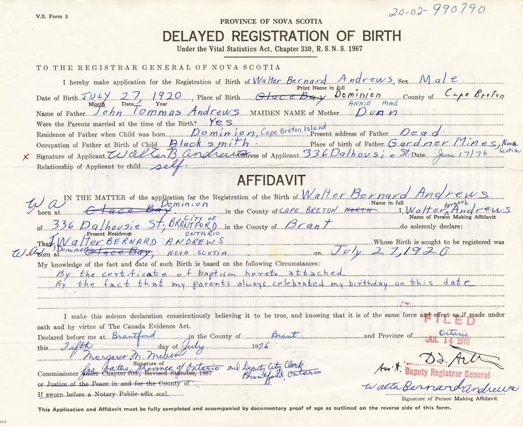 Date of Birth July 27, 1920 Place of Birth DominionCounty of Cape Breton
