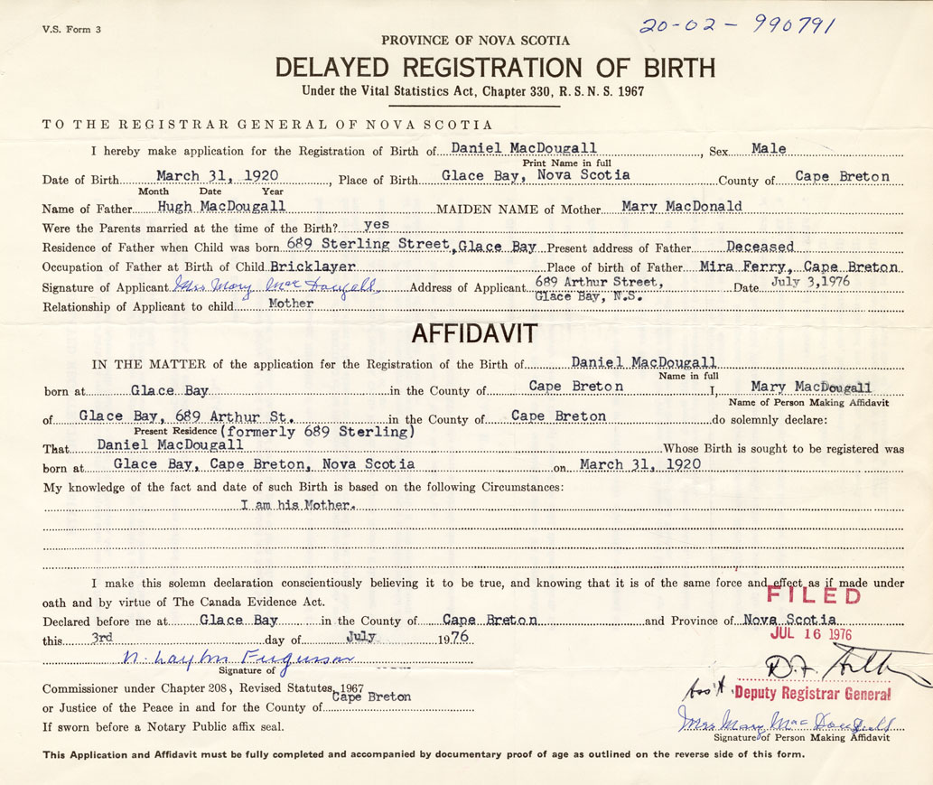 Date of Birth March 31, 1920 Place of Birth Glace BayCounty of Cape Breton