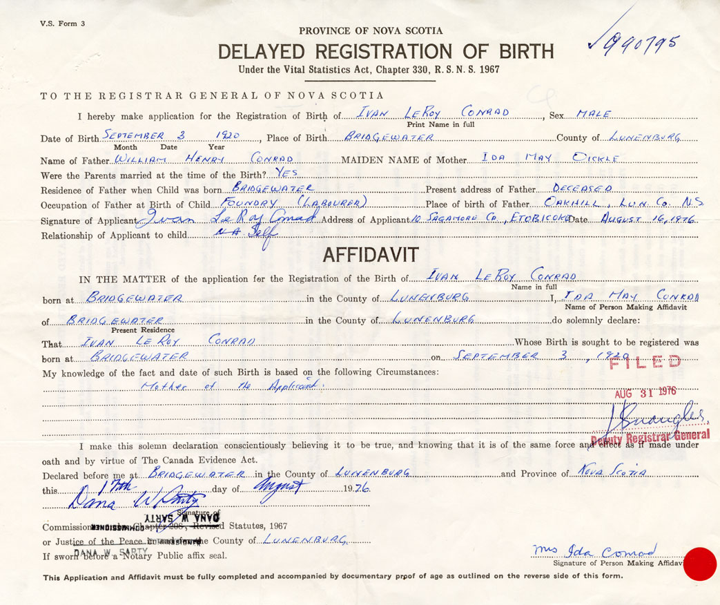 I hereby make application for the Registration of Birth of Ivan LeRoyConrad Sex Male