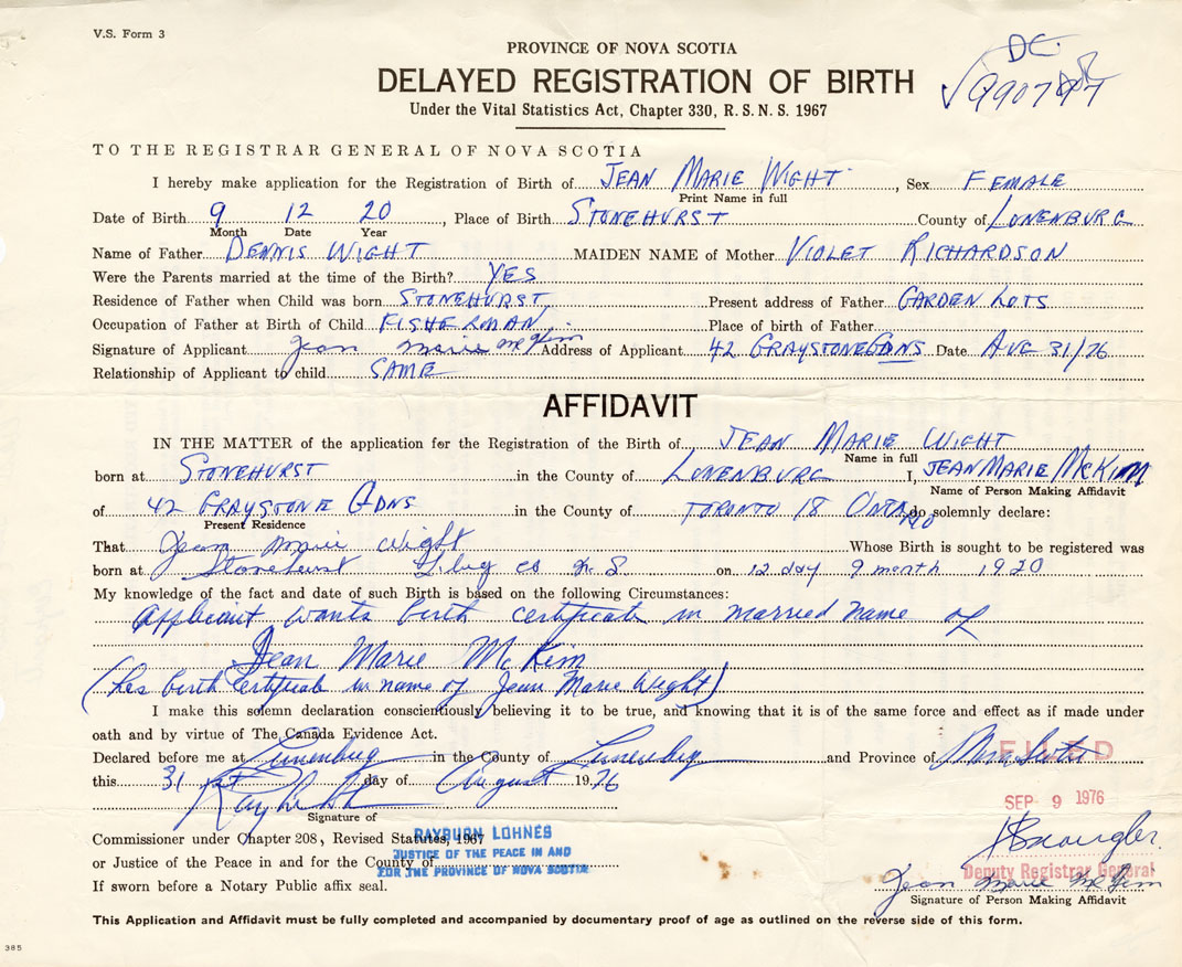 Date of Birth September 12, 1920 Place of Birth StonehurstCounty of Lunenburg