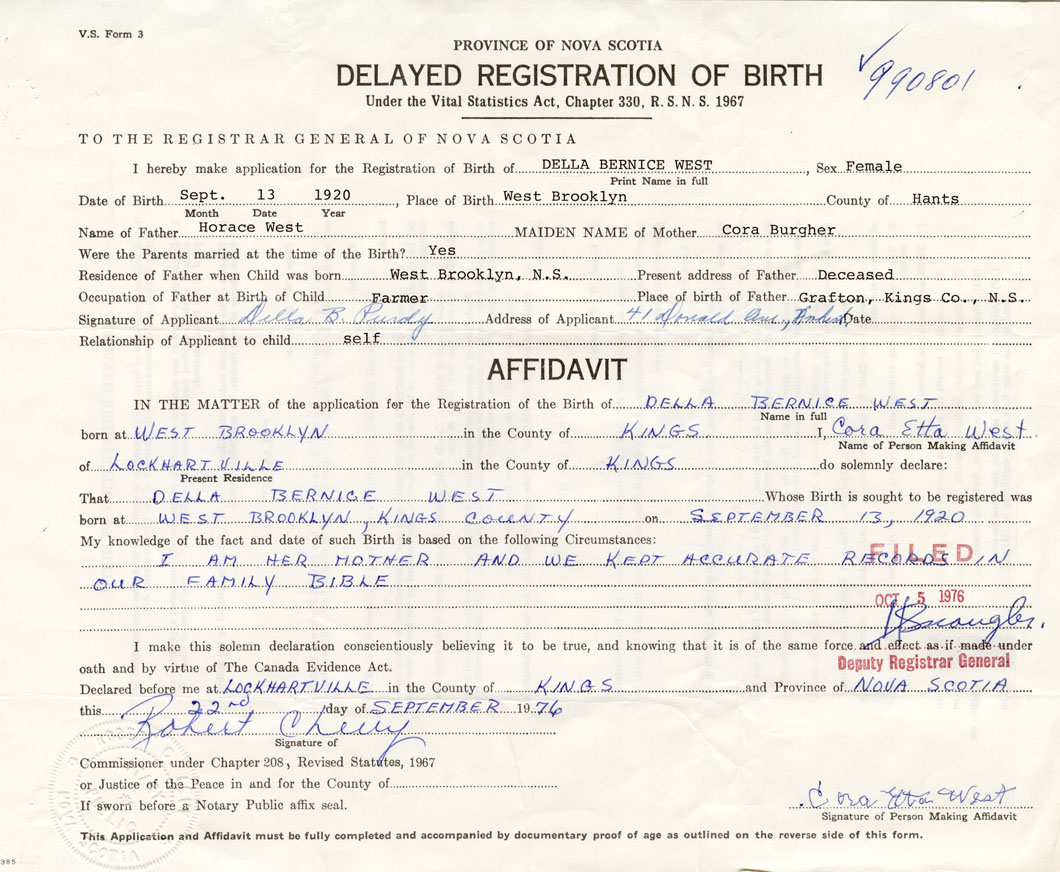 IN THE MATTER of the application for the Registration of the Birth of Della BerniceWest