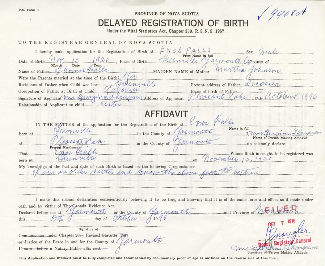 IN THE MATTER of the application for the Registration of the Birth of EnosFalls