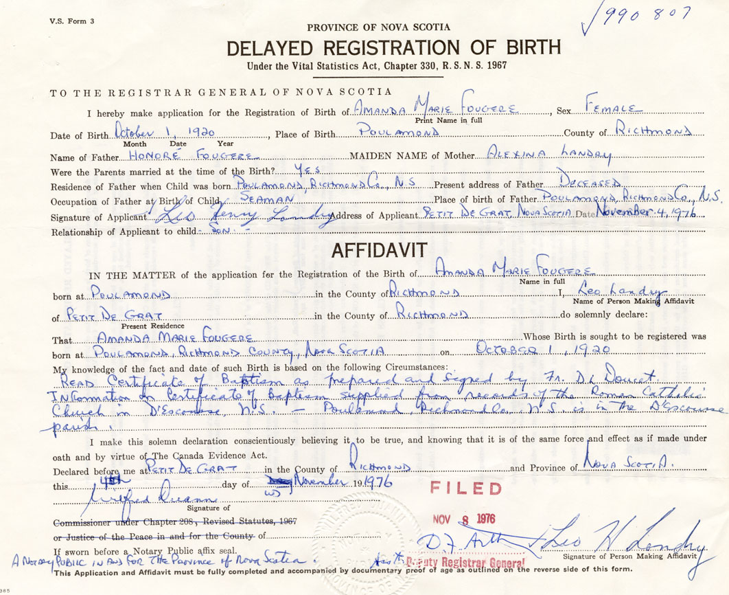I hereby make application for the Registration of Birth of Amanda MarieFougere Sex Female