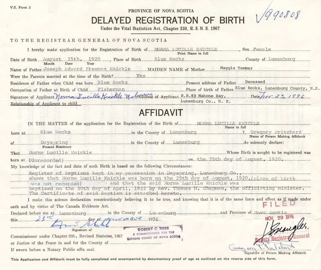 Register of Baptisms kept in my possession in Dayspring, Lunenburg Co., shows that Norma Lucille Knickle was born on the 25th day of August, 1920 (place of birth was not recorded) and that the said Norma Lucille Knickle was baptized on the 30th day of April, 1922 by Rev. thomas H. Chapman, the officiating minister. The certificate of said Baptism is attached hereto.