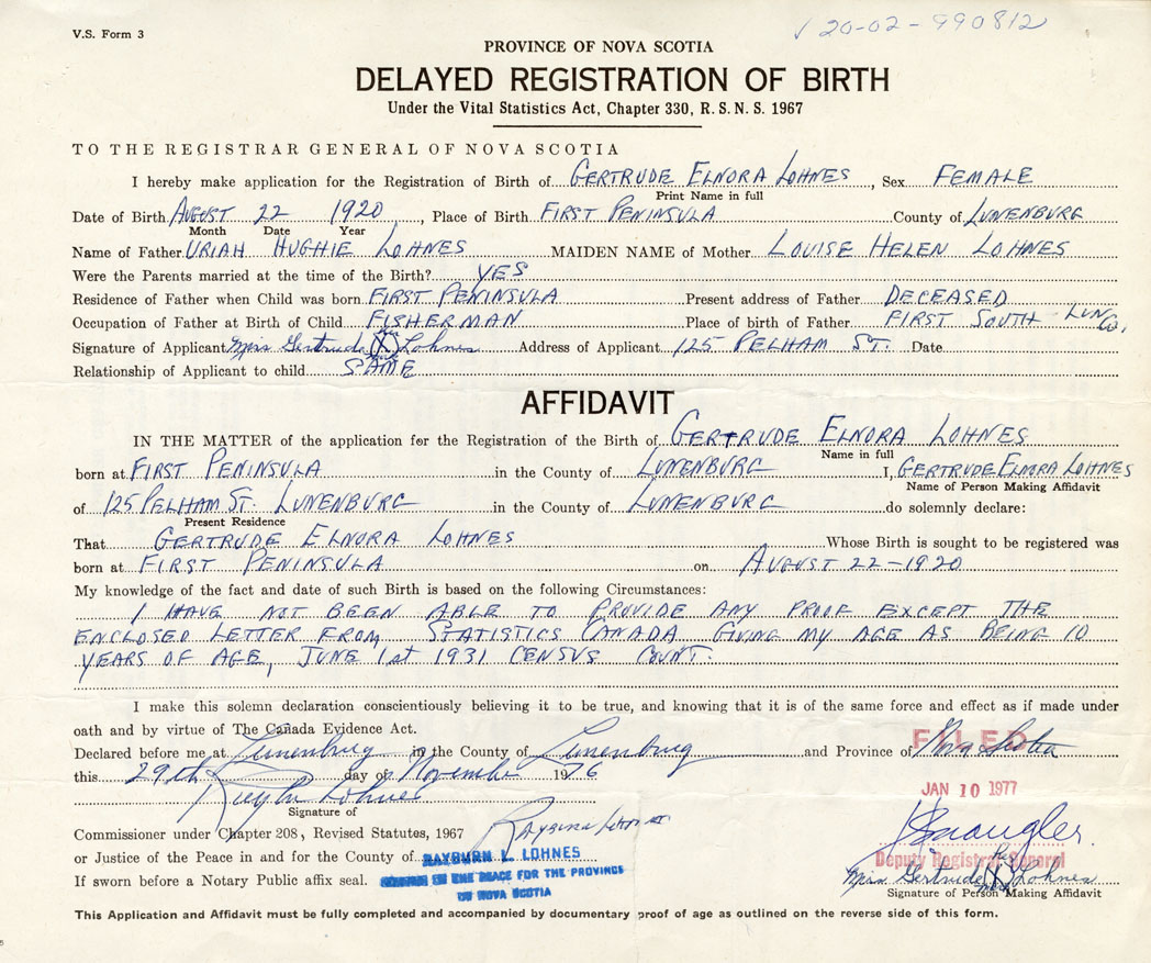 Date of Birth August 22, 1920 Place of Birth First PeninsulaCounty of Lunenburg