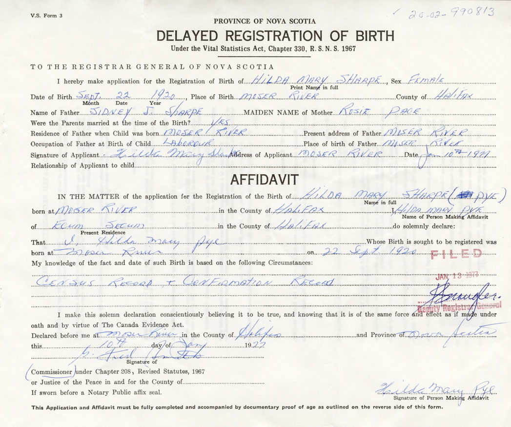 Signature of Applicant Hilda mary Sharpe Address of Applicant Moser River, Halifax Co. Date 10 January 1977