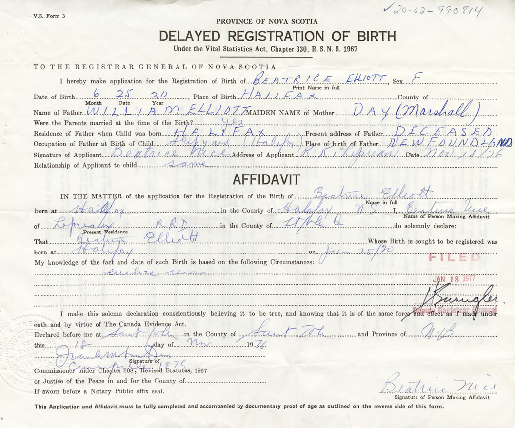 I hereby make application for the Registration of Birth of BeatriceElliott Sex Female