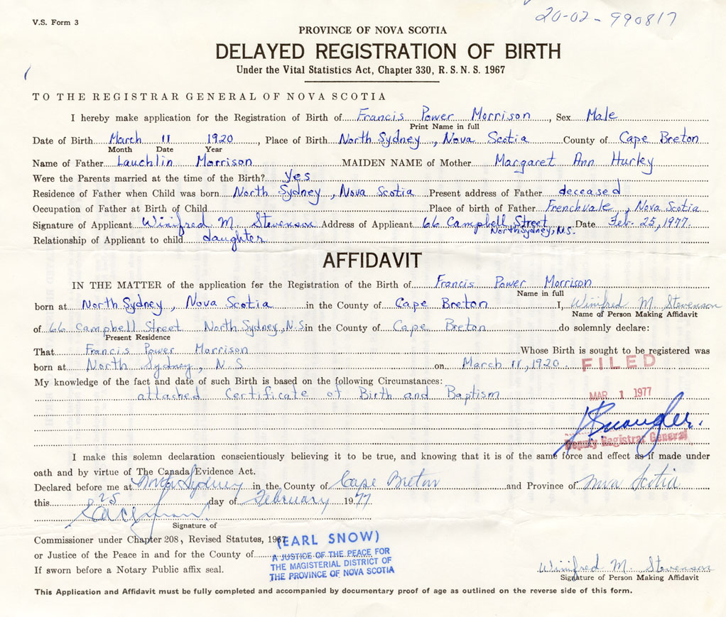 Date of Birth March 11, 1920 Place of Birth North SydneyCounty of Cape Breton