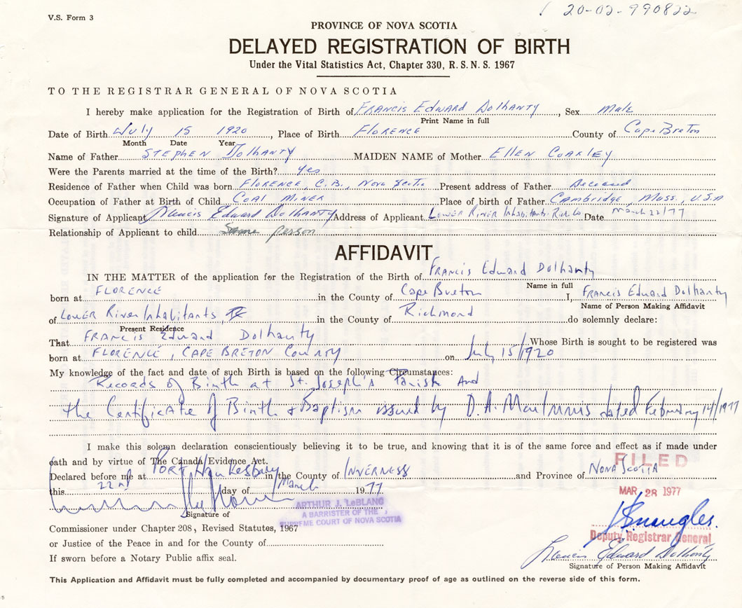 IN THE MATTER of the application for the Registration of the Birth of Francis EdwardDolhanty