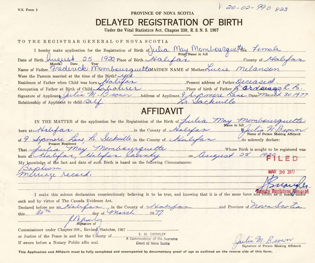 IN THE MATTER of the application for the Registration of the Birth of Julia MayMombourquette