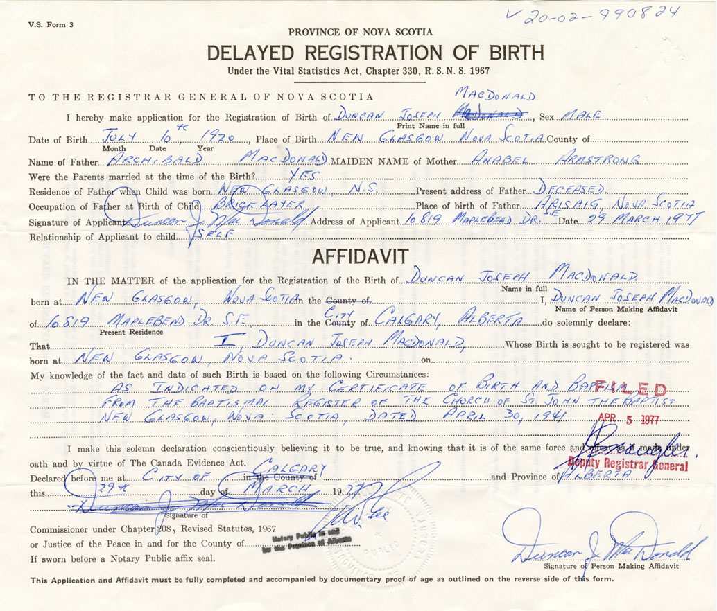 Date of Birth July 10, 1920 Place of Birth New GlasgowCounty of Pictou