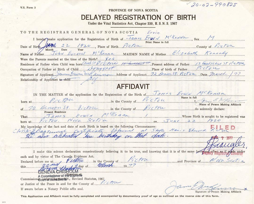 Signature of Applicant James Ervin McKenna Address of Applicant 72 Denoon Street, Pictou Date