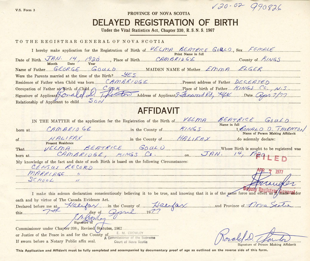 IN THE MATTER of the application for the Registration of the Birth of Velma BeatriceGould